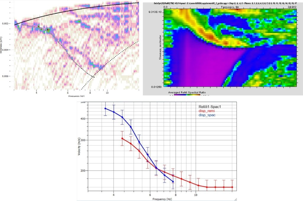In another site I compared the Spac result of an L array (2m spacing) with the ReMi result of the long side of the L array. The Spac seems to provide a dispersion curve with too high velocities based on the frequency of the H / V peak and the depth of the bedrock (greater than 15m, drill hole data).