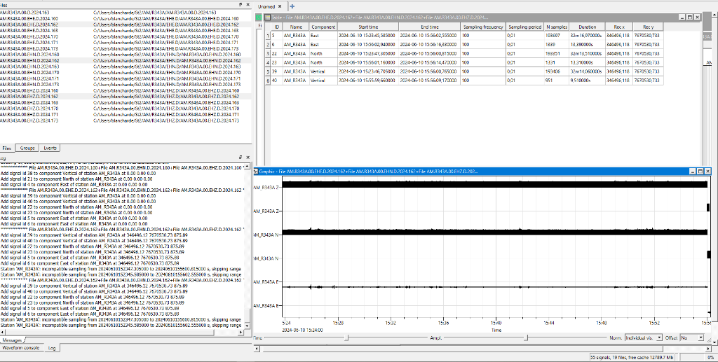 In fact, some Julian days are only recorded over a few hours (or even a few minutes... Certain technical problems with the seismometers persist...). However, I would still like to use this data. I'm sharing with you a screenshot of Julian Day 162 as an example of an attempt at H/V processing. The logs show that the samplings are incompatible, yet each portion of the signal has a sampling frequency of 100 Hz...
