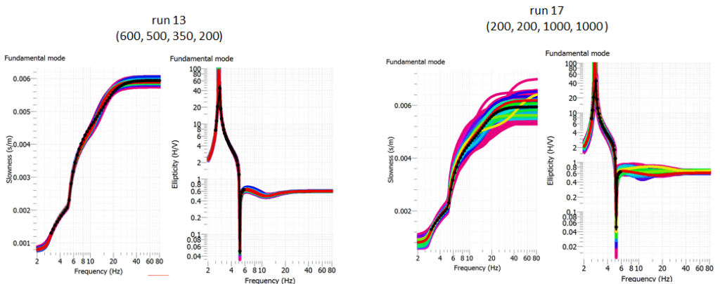 I am inverting the dispersion and ellipticity curves (joint inversion) of a determined soil profile. I am inverting the theoretical curves (dispersion curve for f<3Hz and left and right flank of the elliptitity curve) in order to understand the best way to get to the right velocity profile.