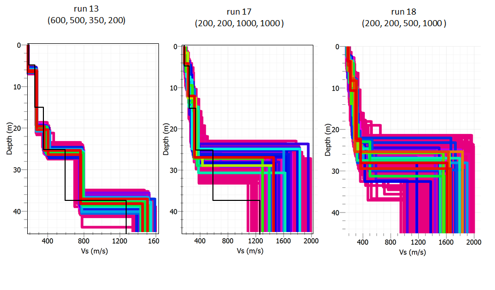- run 18: It = 200, Ns0=200, Ns = 500, Nr = 1000 (200 initial models, 500 models generated in 1000 best cells, right?) [100200 total models] (min. misfit=0.06537)