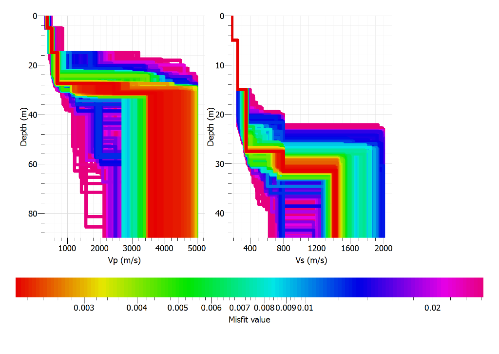 I am obtaining the same tendencies of velocity models (in most of the, the interface between soil and bedrock is around 30m depth, when it should be at 37m depth).