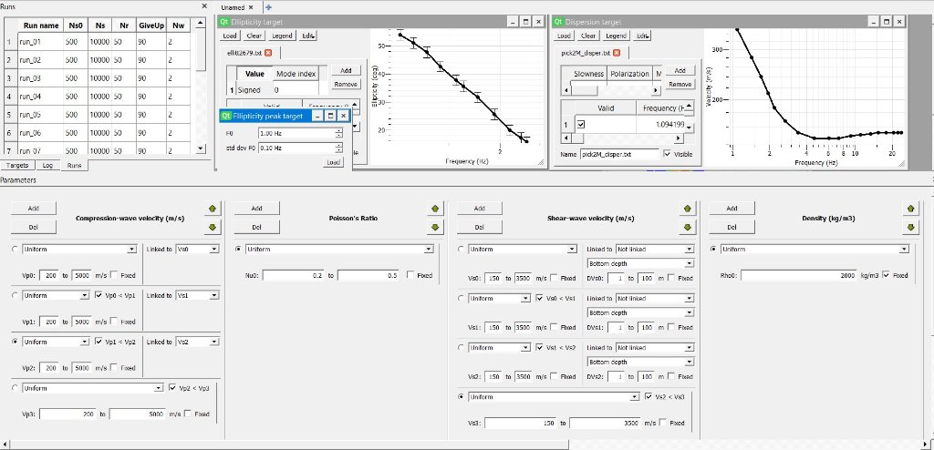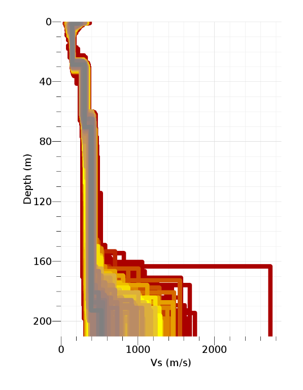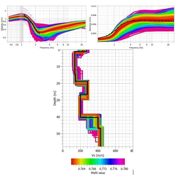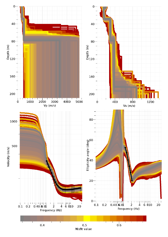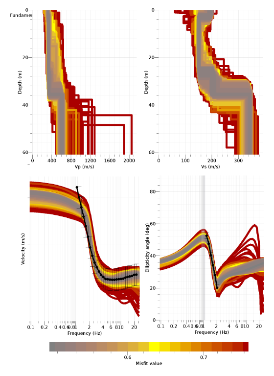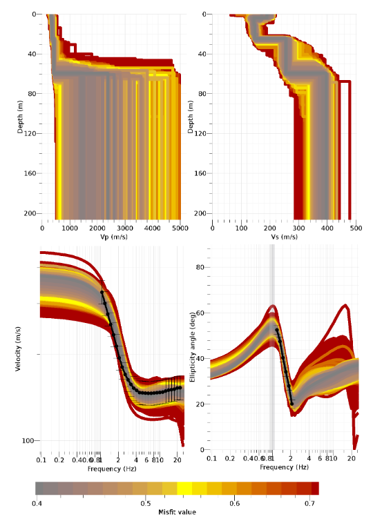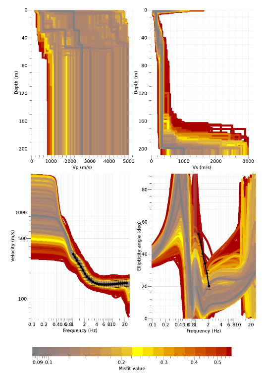 - Vp profiles look very well constrained in the first 40 m. This is unusual. It might be induced by a biased ellipticity curve. You did not specify if it comes from a classical H/V measurement or from a more sophisticated processing aimed at extracting pure Rayleigh waves: HVTFA (NERIES project) or Raydec (Hobiger et al. 2009, to be included soon in geopsy). In classical H/V, Love and body waves can modify the amplitude of the curve, which is not taken into account by dinver modelling, based only on Rayleigh waves.