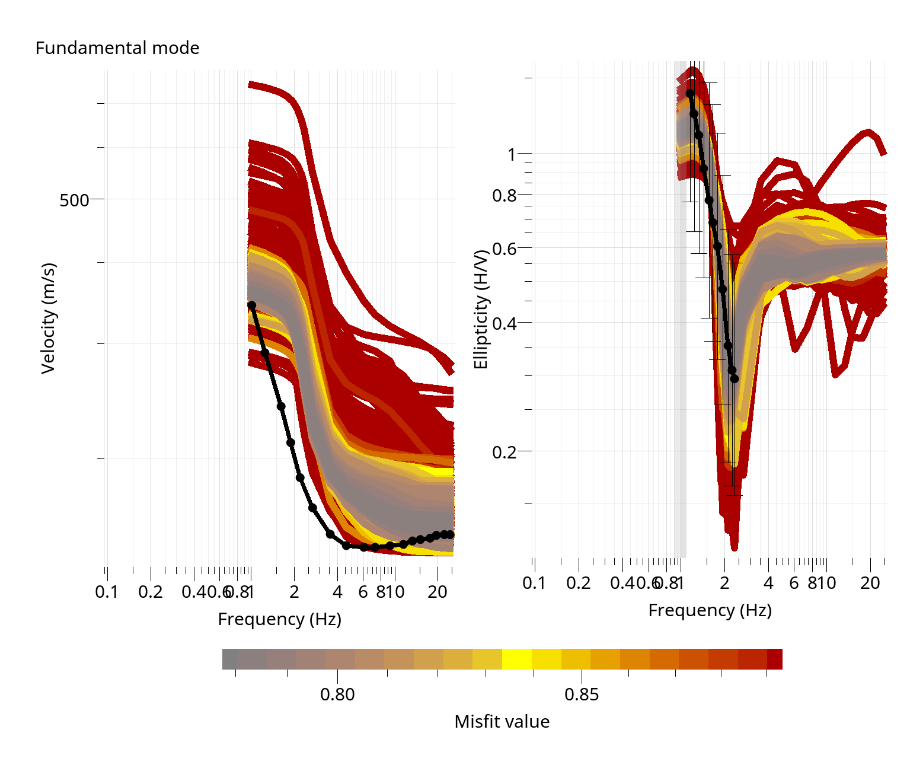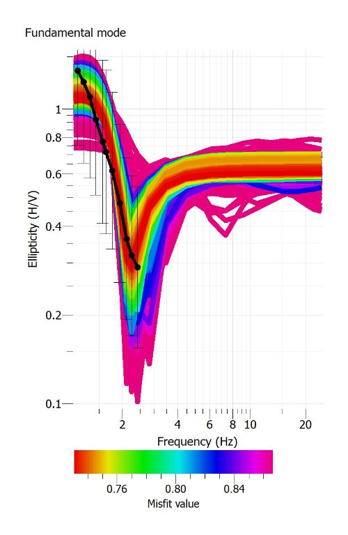 This warning is issued when computing a theoretical ellipticity peak, if the obtained peak is outside the user frequency range. The frequency sampling and its range is defined by merging all samples from all target curves (dispersion and eventually ellipticity). For efficiency, it is better to have the same sample set for all curves: computing an ellipticity value requires the Rayleigh dispersion value at the same frequency. Before running anything it is always better to resample all curves in the same way (e.g. 50 samples on a log scale). If a curve is not available over the complete range, invalid samples are added, these frequencies will not be considered for the misfit computation. When including the peak frequency in the target list, you have to add extra samples at low frequency. For instance, if the dispersion curve is available from 2 to 20 Hz and the observed peak is at 1 Hz, you have to resample from at least 0.5 Hz. If deep ground structures are produced by the parameterization, the warning may still appear. In your case I resample everything from 0.1 to 25 Hz with 50 log samples. The warning is visible a few times at the beginning and then disappears as long as the inversion focuses on the area of interest.