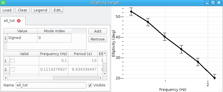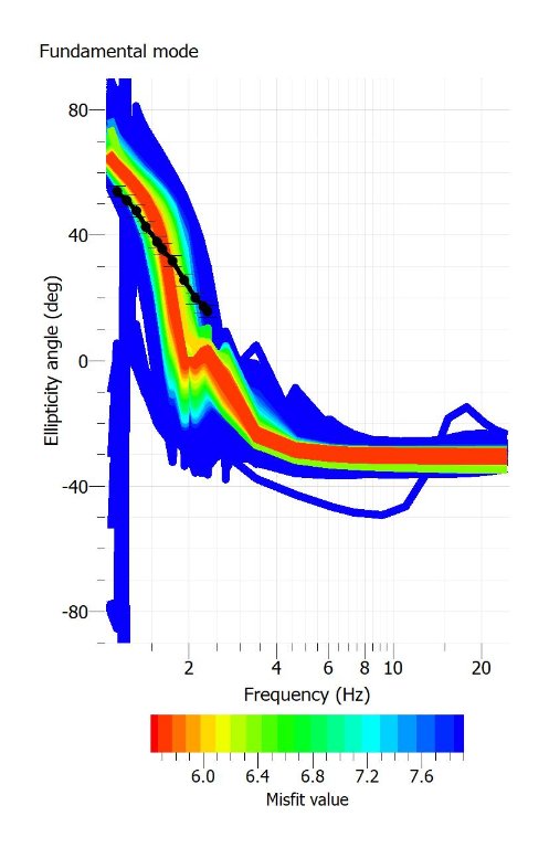 The next step is to set the correct type to the ellipticity curve. In fig_335-02.png, you have to change "Signed" to "Absolute". The misfit drops to 0.85 and the results are shown in fig_335-03.png. There is a strange feature around the ellipticity peak. fig_335_04.png shows the signed and absolute values of the ellipticity for the best model, zoomed around the peak. The signed curve must be smooth. The absolute ellipticity on a log scale may have singular points produced by the absolute value. The values between 0.9 and 1 Hz are the plain ellipticity values instead of the angular ellipticity. atan(-1.1)=-47.7 deg, the correct angular ellipticity at that frequency. That's a bug encountered while inverting for the peak frequency. This artefact disappears if the peak frequency is deactivated in the target list. Refined values computed for getting the exact peak frequency are not properly transformed to angular ellipticity. This is now fixed for the next releases (3.3.6-preview under preparation).