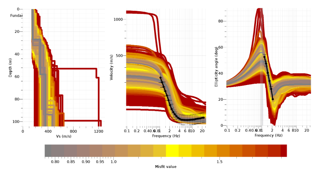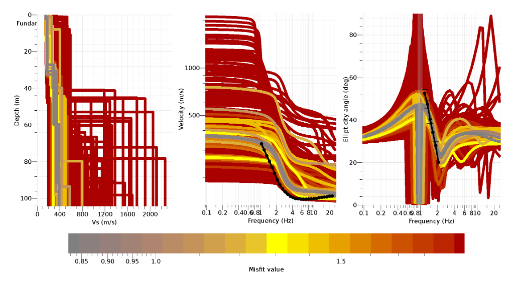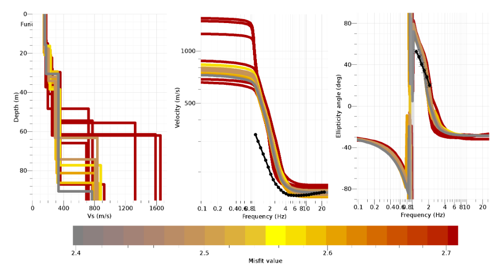 The dispersion curve is bending towards an increase at high frequency. This kind of shape can be the signature of a low velocity zone (LVZ) prohibited for default parameterizations. Let's relax this condition for the second layer: Vs1 can be lower than Vs0. I obtained a minimum misfit of 0.51 after 30000 models. The results are shown in fig_336-04.png. High frequency par of the dispersion curve is fine and the ellipticity as well. Lower frequency part of the dispersion would still require a better fit. Profiles are constrained by the targets to a maximum depth of 40 m. An additional layer would probably provide an expected degree of freedom. I force it to be between 40 and 200 m to explore the deeper part.