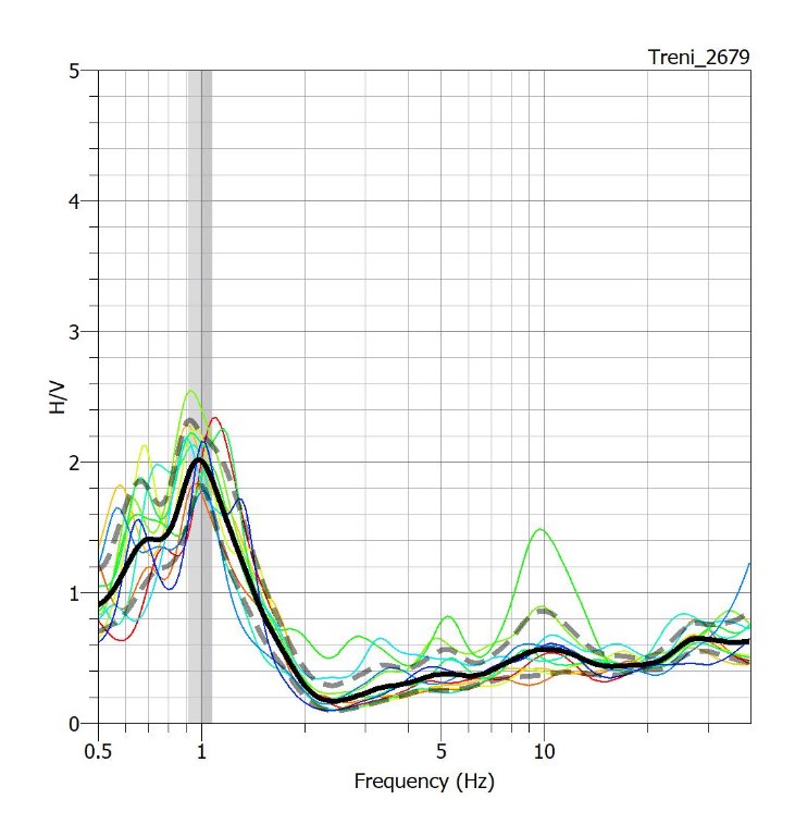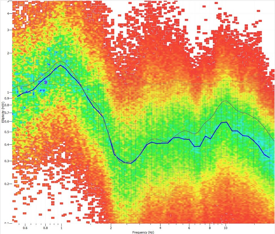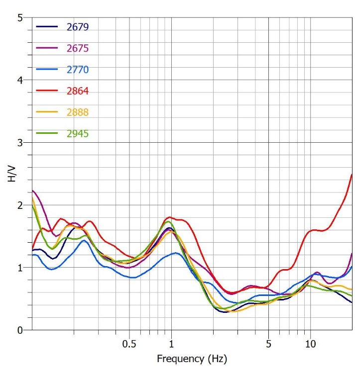 Finally I would like to know what could be the reason for the low amplitude of the H / V peaks. At about 1km, same geology, there is an hvsr test with a 1.2Hz peak and 3.5 amplitude.