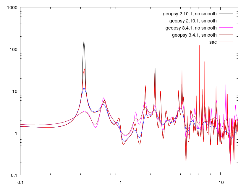 I am carrying out some h/v on earthquakes with geopsy-hv in geopsy 3.4.1, and comparing the results with those obtained with geopsy 2.10.1. I made several tests, both without smoothing and using the Konno-Ohmachi smoothing (with SMOOTHING CONSTANT = 40 in geopsy 2, SMOOTHING_WIDTH = 0.2 in geopsy 3).