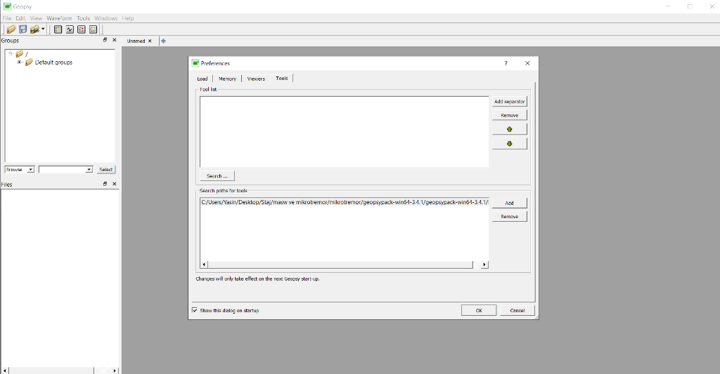 I downloaded the 3.4.1 version of the Geopsy program to my computer with the Windows operating system. When I start the program, the tools do not appear in the "Preference" window. Also, some of the toolbars in the upper left are unavailable. I downloaded other versions of the program but nothing changed. I've attached a screen shot of the problem I'm encountering. What is the cause of this problem? How can I fix? I am waiting for your answers.