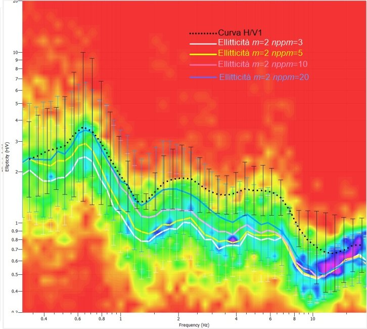 In the case that I submit to you I would like to know if the choice made is correct or not. In the first image I have the H/V curve and those of ellipticity with different values of m and nppm = 10 (the time series have a duration of 1h). In the second I plotted the curve with m = 2 (which I considered the best) with 4 nppm values, from 3 to 20.