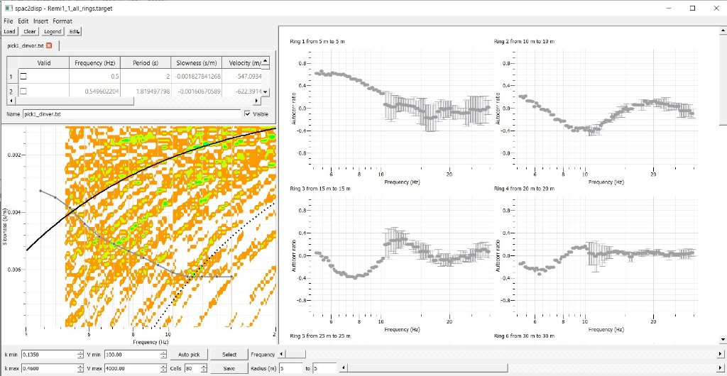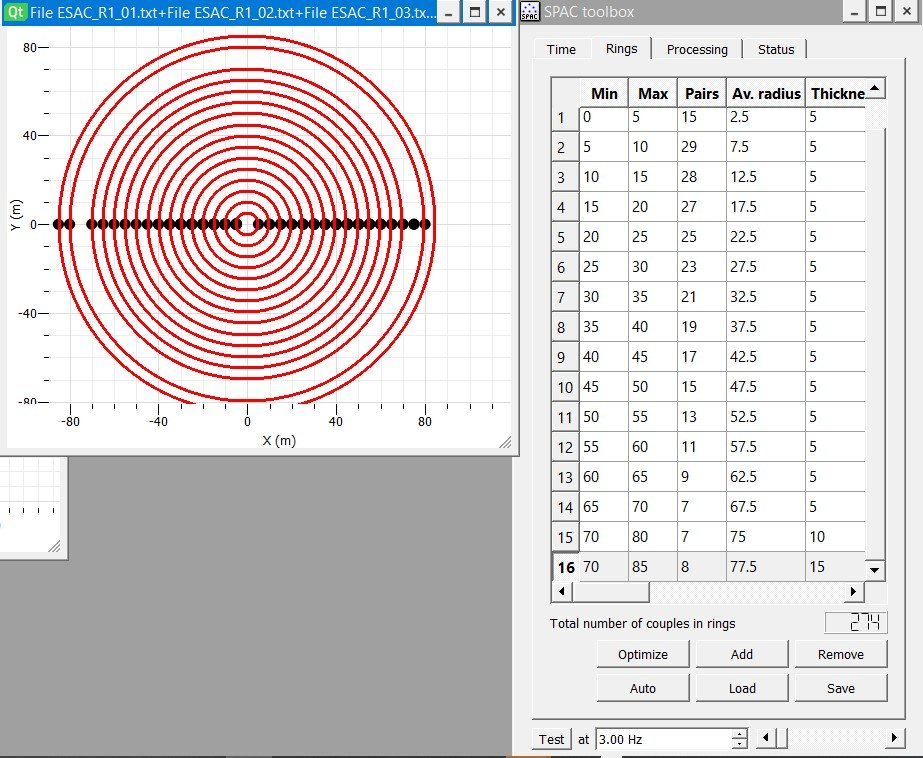I found a way to get a target file from the ReMi data by setting a frequency dependent window = 2-3T. The result is not encouraging (remi_spac1_allrings.jpg) and the superposition of the ReMi1 dispersion curve makes it evident that no dispersion is present. Reducing the number of rings and using only 4 rings (second, third, fourth and fifth) it seems to me that the target file is less confused and, with good will, we can guess a faint dispersive trend (ReMi1_spac_4rings.jpg).