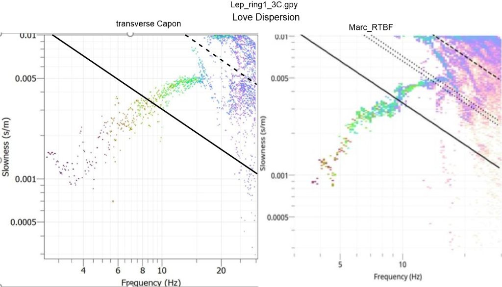 Finally, I took the liberty of comparing the output of Passive Transverse Capon, mine, with your RTBF - Love dispersion reported in the documentation (love.png attached) where is possible to notice some similarity between the two dispersions, but where it is much more "energetic "that generated by RTBF. But I don't think this is a Love dispersion because, if the data set is the same, the Rayleigh RTBF vertical dispersion has a greater slowness than that of the Love RTBF dispersion. Is the observation correct?