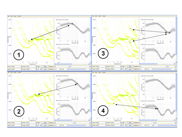 * By using the ''Frequency'' and ''Radius'' scroll bars and associated sliding cursors [[Image:SPACToolbox_SPAC2DISP_CursorBottomRightPanel.png|300px]] , one can check for each frequency and each ring relation between autocorrelation coefficient and phase slownesses, as displayed by the black dots in the figure below.