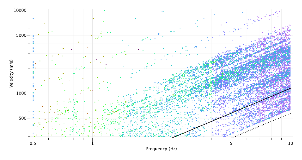 - if you plot the theoretical array response over your results, you will see that all results are above the resolution limit of the array (see Wathelet et al. 2008 for instance). With Conventional FK, you will not get any valid dispersion above kmin.