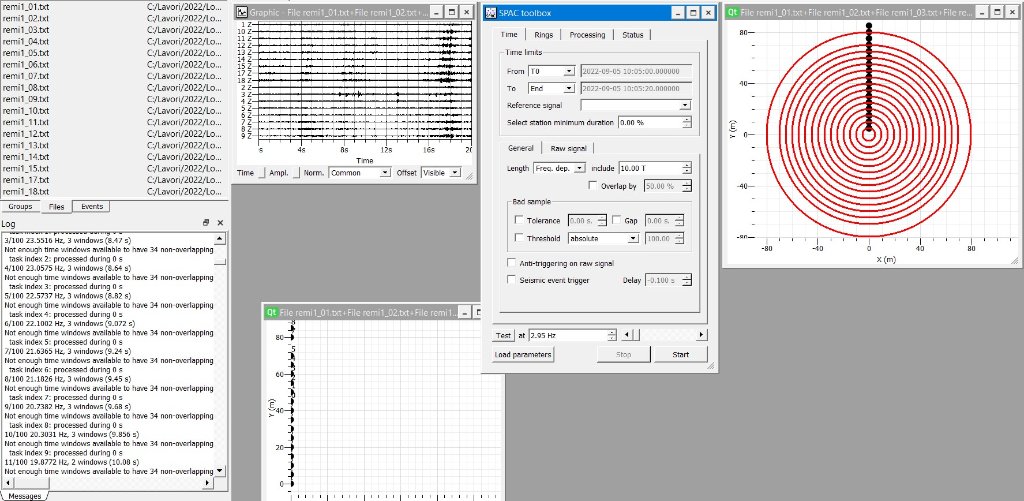 I found a way to get a target file from the ReMi data by setting a frequency dependent window = 2-3T. The result is not encouraging (remi_spac1_allrings.jpg) and the superposition of the ReMi1 dispersion curve makes it evident that no dispersion is present. Reducing the number of rings and using only 4 rings (second, third, fourth and fifth) it seems to me that the target file is less confused and, with good will, we can guess a faint dispersive trend (ReMi1_spac_4rings.jpg).