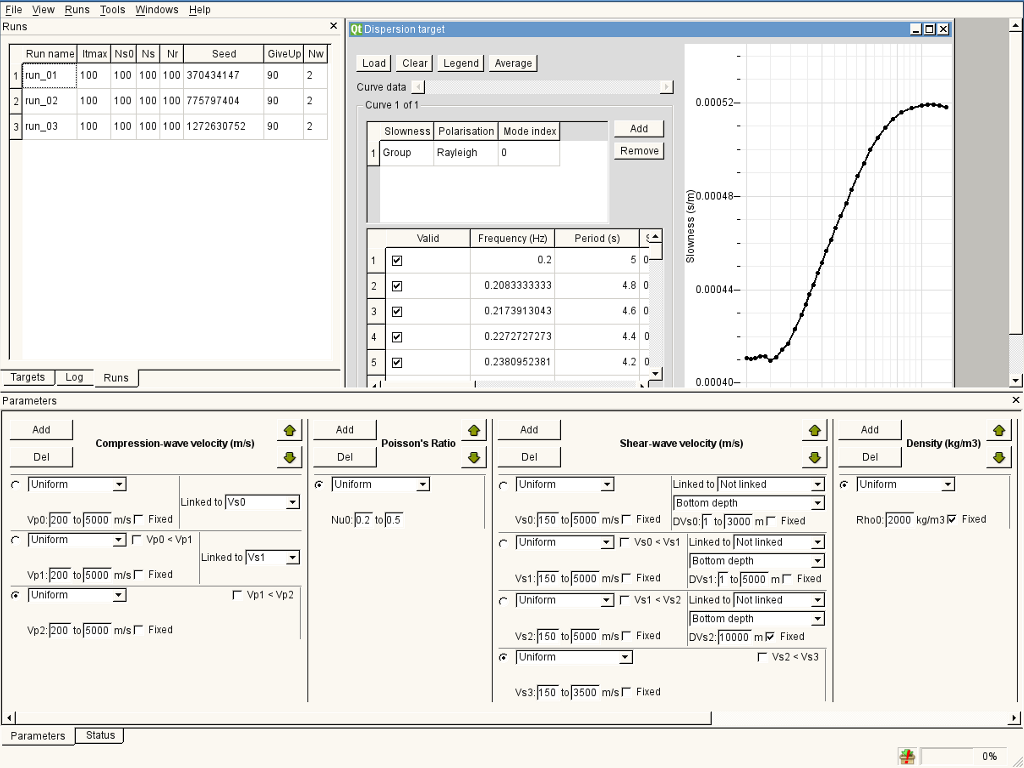I want to determine 1-D velocity profiles from seismic ambient noise. I have performed cross-correlations between stations from a noise array, and have then performed a frequency-time analysis to get the dispersion curves. To calculate the dispersion curves I have been using Bob Herrmann's do_mft program. I have been using Bob Herrmann's surf96 program to calculate 1-D velocity profiles, which can have many layers of fixed thicknesses. I like to use Dinver with the neighbourhood algorithm.