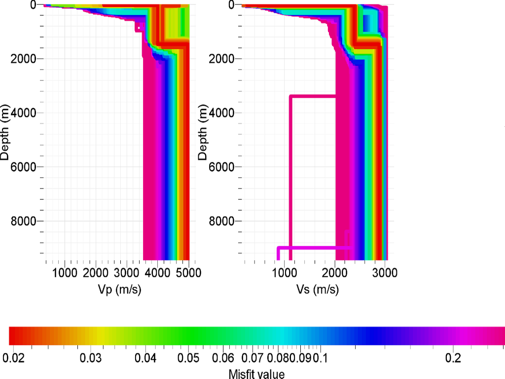 Right, random depths will be generated between 9000 and 10000 m. Do not be afraid of having a large range (e.g. 1000 to 10000) for a first try, to test roughly what can be inferred from your data. If it fails, try to restrict ranges. Same remark for velocity ranges. About depth or thickness, depths are preferred, see literature why (Wathelet 2008).