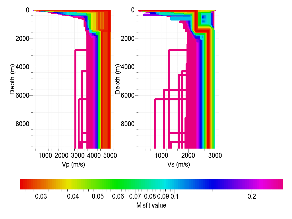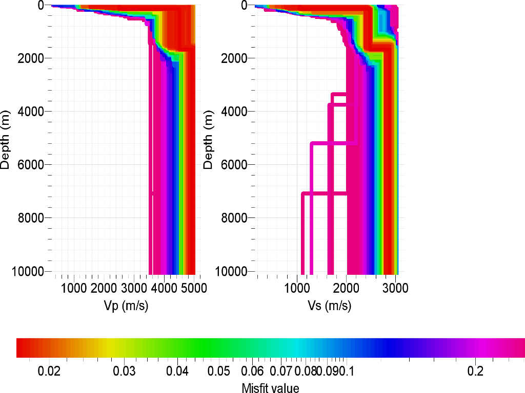 With the different misfits between runs I do get different looking profiles. For example, Vs is calculated to a depth of 2000m or 4000m for one run, while another run it's calculated down to 10000m.