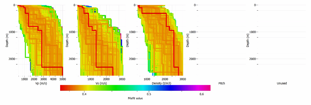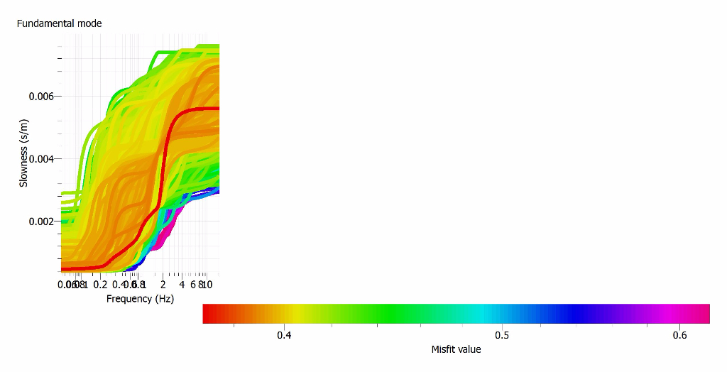 When I process it using autocorr in dinver, I set 7 layers with different vs and vp, a single possion's ratio and varying density for each layer. However, after starting a run, only a single misfit value is shown (only a single red line).