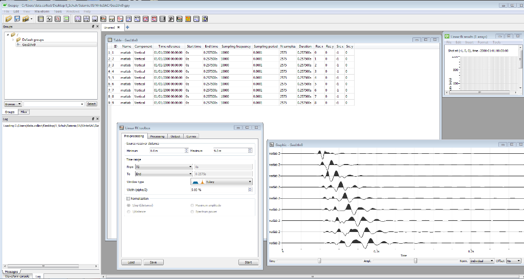 I'm attempting to use the active F-K toolbox to view a dispersion curve. I downloaded the example dataset from the Geopsy documentation and it works just fine. However, when I attempt to run the same process on my own dataset, the progrm doesn't seem to recognize the data (the wavefroms don't turn green, see attached image).