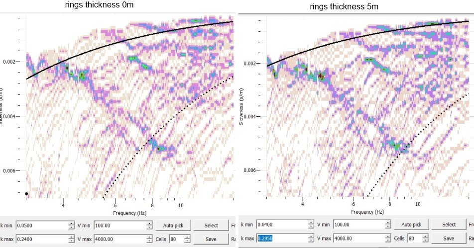 On the contrary, the use of only the first rings in the Spac files seems to me to be decidedly more significant as it seems to me that the dispersive trend appears much more focused than the one that results using all the rings. I also considered only 10 geophones and 4 rings and it seems to me that the dispersive trend is closer to that of the ReMi spectrum. This would mean that with an array of 10 geophones I can have the same result (in terms of depth of investigation) as that obtainable with an array of double length. If this were true, the maximum wavelength formula for a linear array would become, in this case, lambda = 2pi/0.5k.