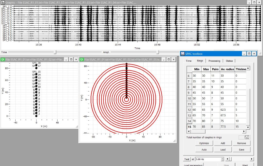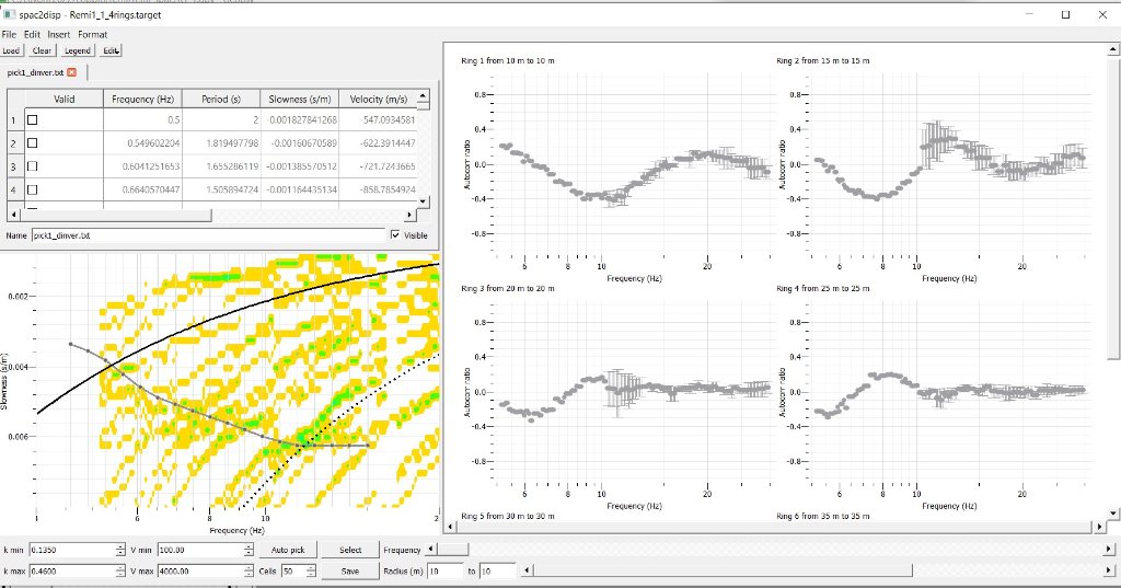 I found a way to get a target file from the ReMi data by setting a frequency dependent window = 2-3T. The result is not encouraging (remi_spac1_allrings.jpg) and the superposition of the ReMi1 dispersion curve makes it evident that no dispersion is present. Reducing the number of rings and using only 4 rings (second, third, fourth and fifth) it seems to me that the target file is less confused and, with good will, we can guess a faint dispersive trend (ReMi1_spac_4rings.jpg).