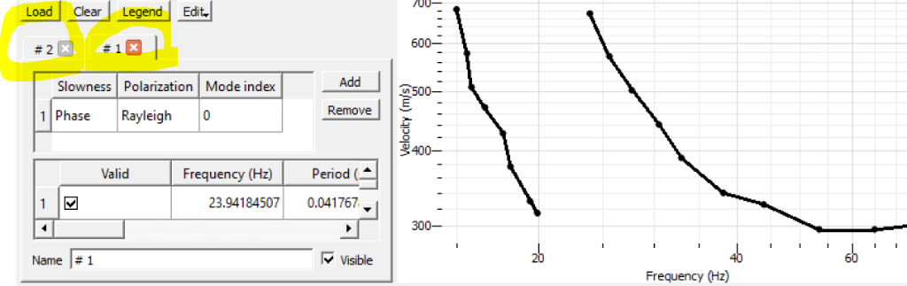 I have problem removing the line between the points that the mode changes ( line between points on the x value of 20 and 25)! if I remove points, the line attaches to the next point. The idea that i came up was saving different files for different modes and load them in dinver separately. in this case, we have different tabs for our dispersion curves and I am not sure if the inversion understands it correctly ( i do not want to have two tabs--they are highlighted with yellow)?